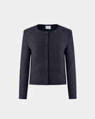 Damenjacke strukturiert • Recyceltes Polyester aus PET-Flaschen • ALINE CELI Couture • Kurzjacke • Geometrische Struktur • Stoffüberzogene Knöpfe • Rundhalsausschnitt • Nachhaltige Mode • Bewusster Luxus