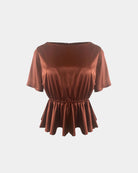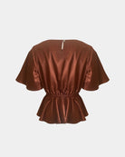 Top with a round neckline, open in the back in the neck, close with a button. Elbow length sleeves and an elastic in the waist.