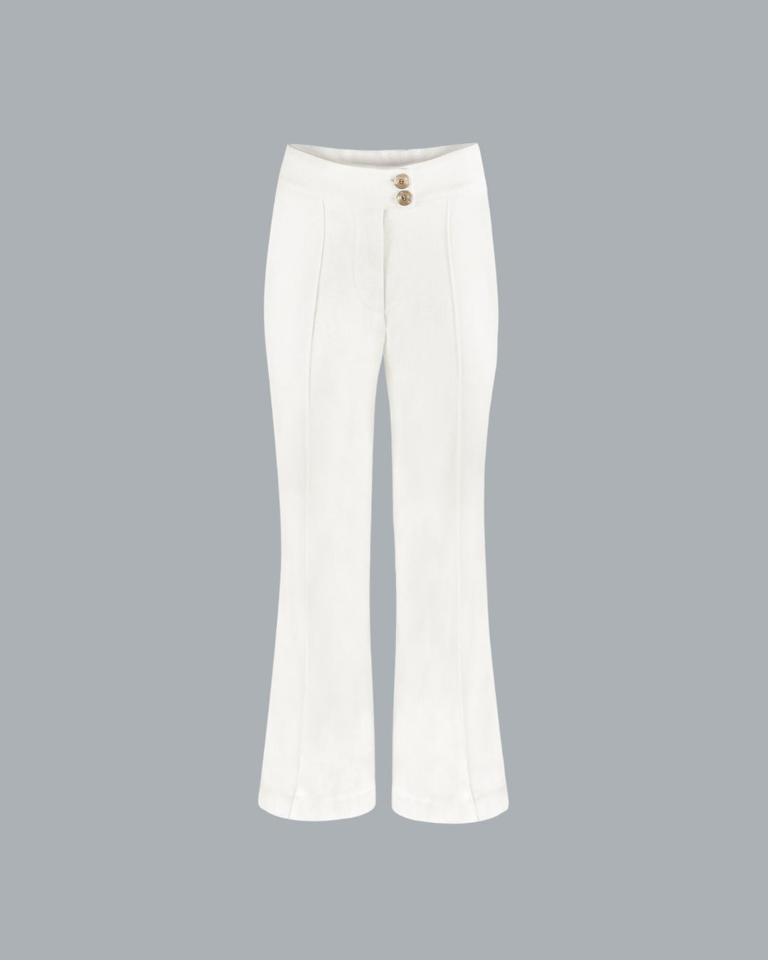 These high-waisted wide-leg trousers are crafted from linen, giving them a relaxed yet sophisticated texture. They feature a tailored front with two visible buttons at the waistband, subtle pleat detailing extending down the leg, and functional side pockets.