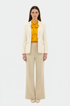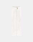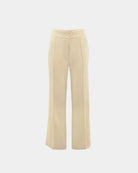 These high-waisted wide-leg trousers are crafted from linen, giving them a relaxed yet sophisticated texture. They feature a tailored front with two visible buttons at the waistband, subtle pleat detailing extending down the leg, and functional side pockets.