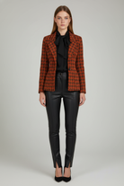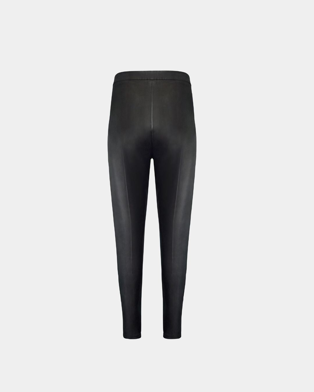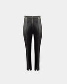 These slim-fit trousers are crafted from innovative black pineapple leather, giving them a sleek, matte finish. They feature vertical seam details down the front of each leg, a single-button closure at the waist, and decorative gold-toned metal stirrup-style details at the hip, adding a subtle embellishment. The hem is split at the ankle.