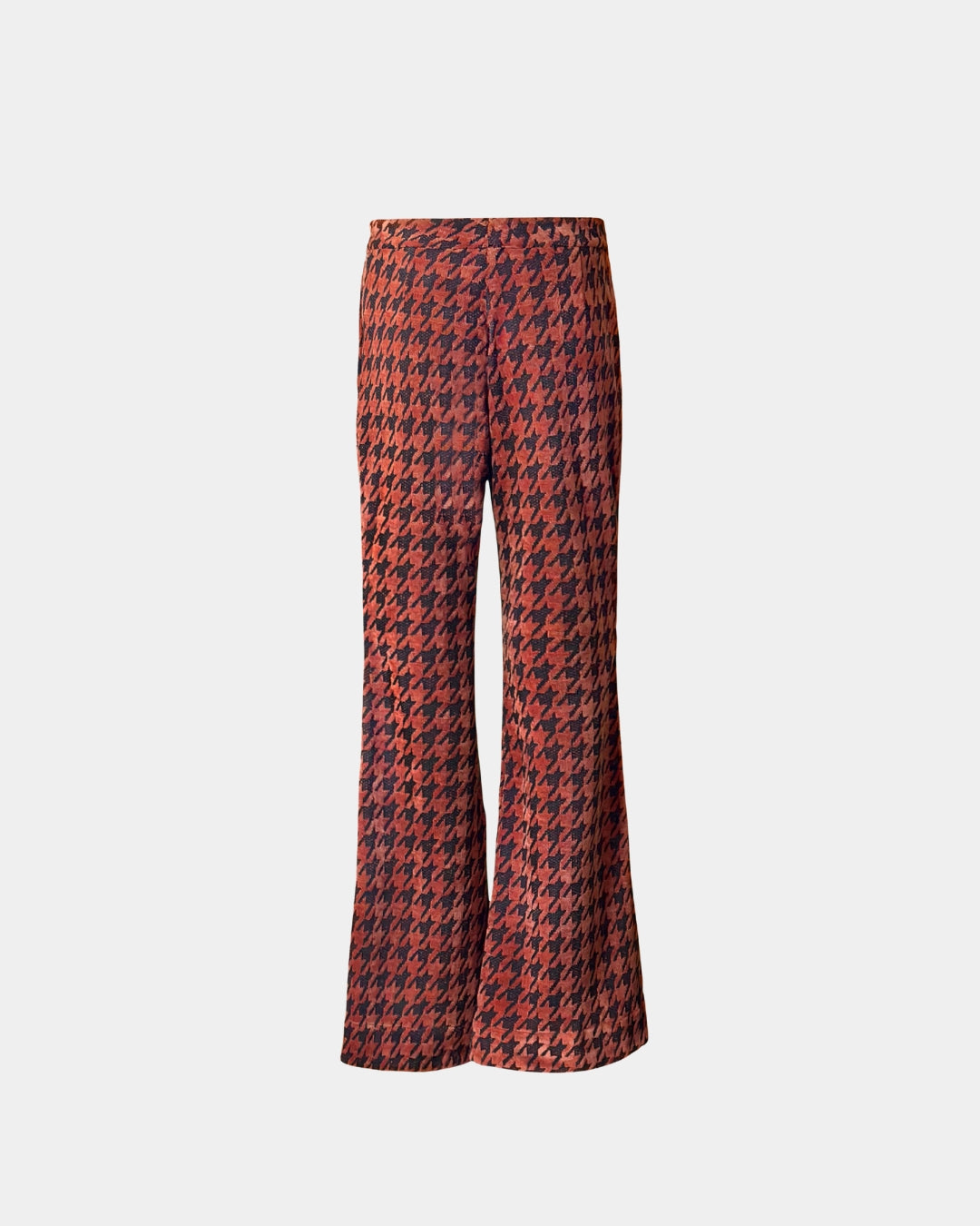 These flared trousers are made from a textured fabric featuring a small houndstooth pattern in shades of brown and black. The fabric has a very fine, short pile, giving it a velvet-like feel. They are designed with a fitted waist and flare out significantly from the knee downwards, and they include pockets.