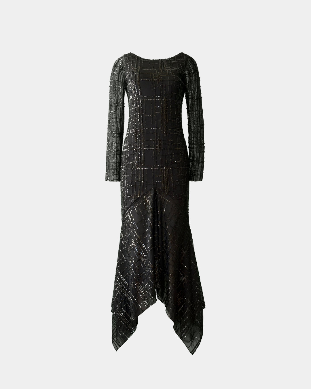 Gefertigt aus recyceltem Polyester aus PET-Flaschen, Bio-Leinen und nachhaltigem Leder aus Ananasschale, werden unsere Kleider mit besonderen Oberflächen und Texturen veredelt – darunter Pailletten, gold- und silbermetallische Effekte sowie das klassische Pied-de-Poule-Muster, neu interpretiert in einem modernen, klaren Stil.