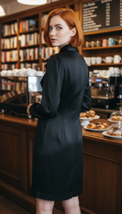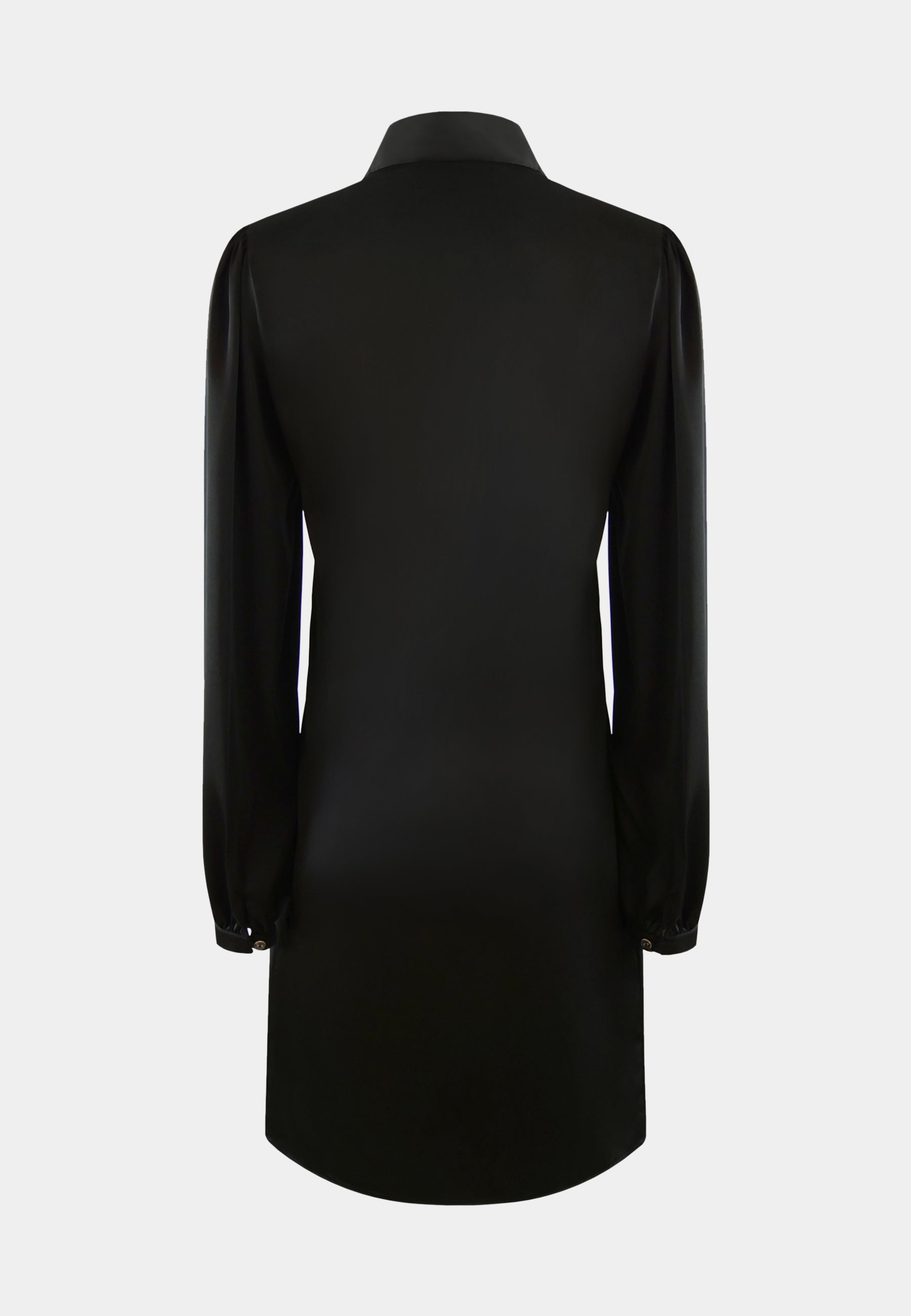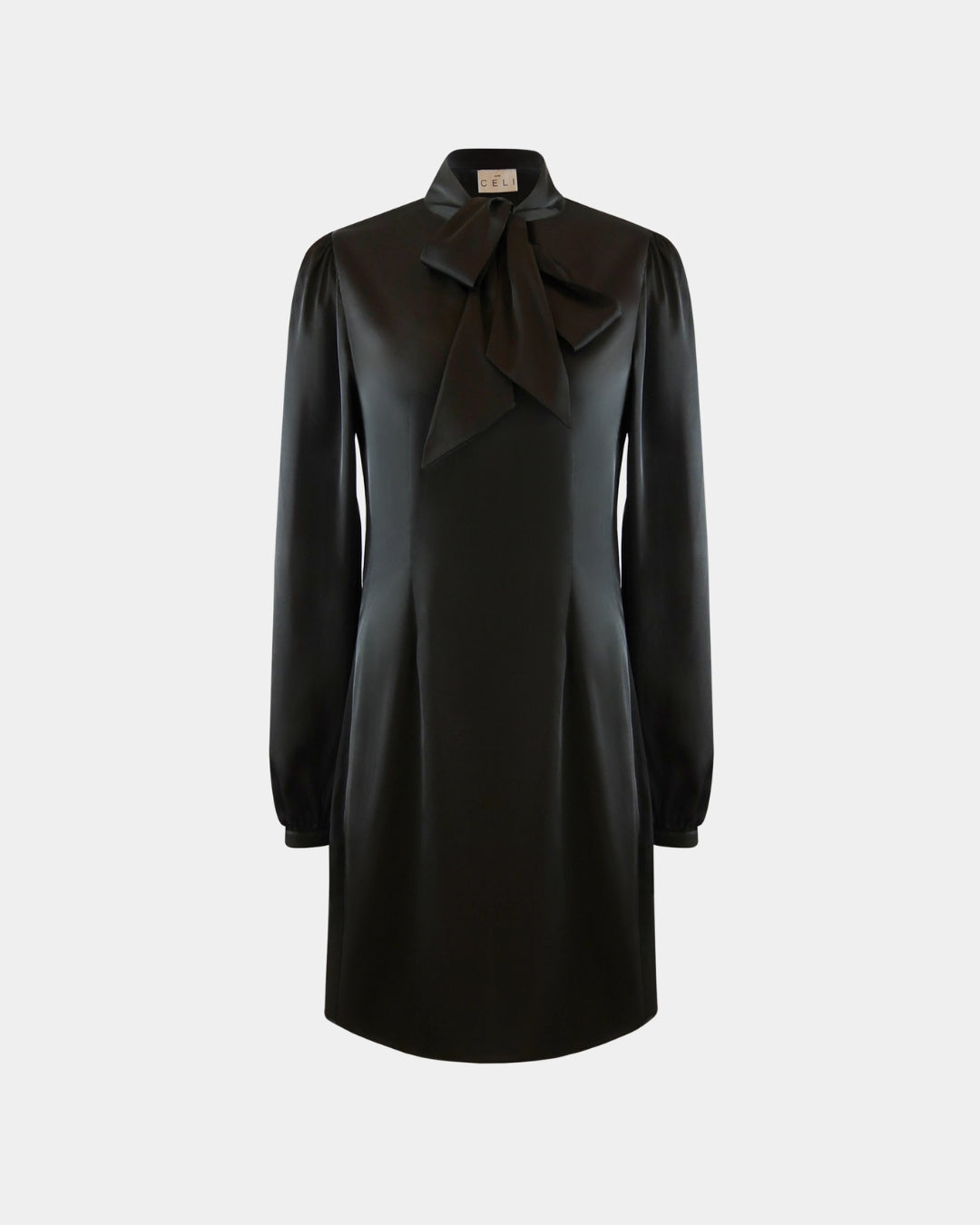 This sophisticated black mini-dress, crafted from recycled polyester, features a high neckline with a dramatic pussy-bow tie detail. It has voluminous long sleeves gathered at the cuffs and a keyhole cutout at the chest, adding an alluring touch. The dress has a straight, relaxed silhouette that falls above the knee. The back of the dress is plain.