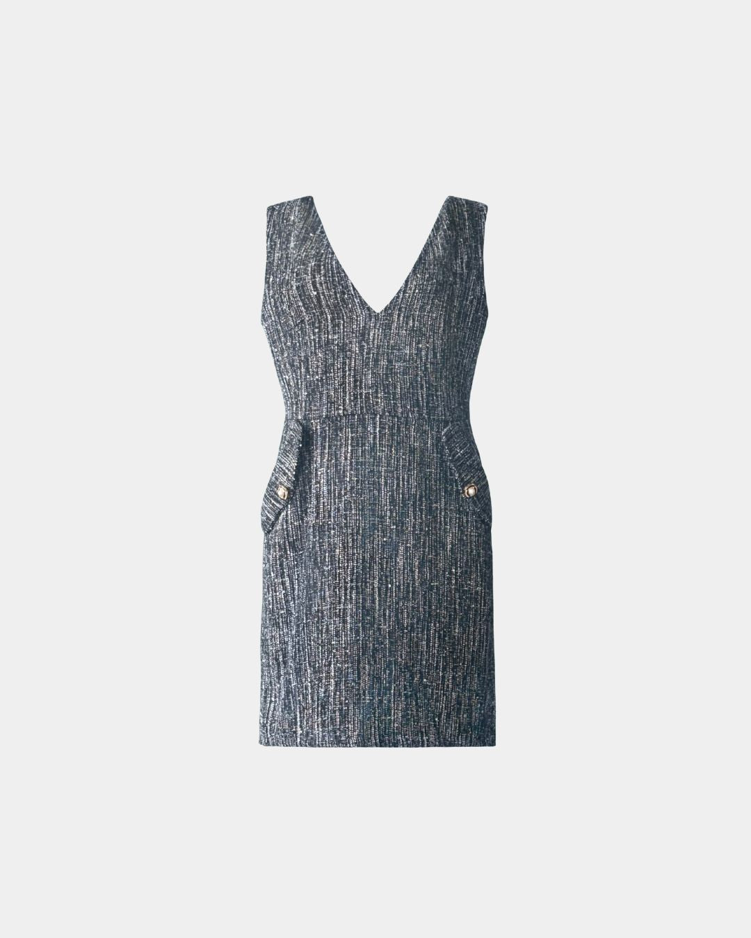 Der tiefe V-Ausschnitt und der taillierte Schnitt betonen die Silhouette, während seitliche Pattendetails mit Metallknöpfen dem Design einen couture-inspirierten Charakter verleihen. Das satinierte Innenfutter aus recyceltem Polyester (PET-Flaschen) sorgt für Komfort und Bewegungsfreiheit – ideal für elegante Tages- oder Abendanlässe.