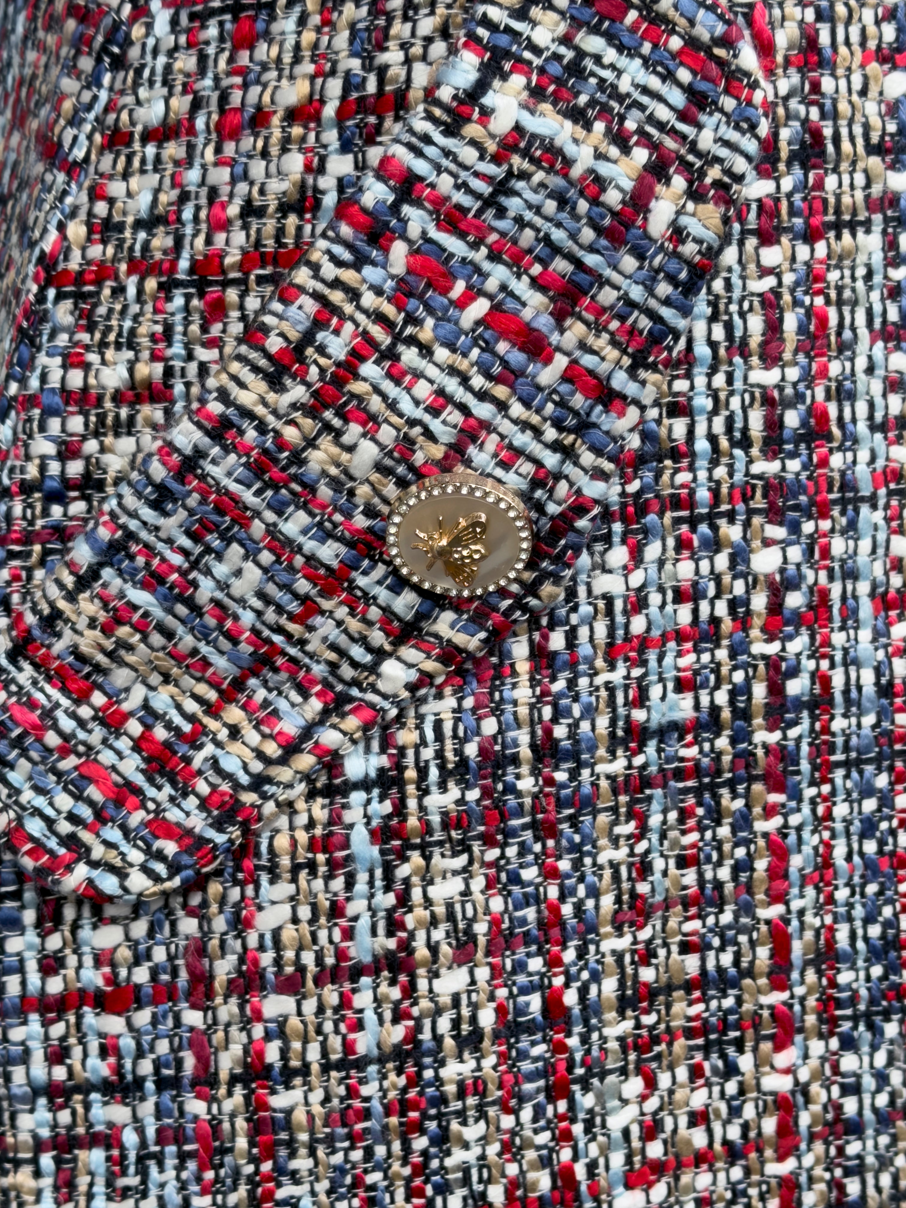 Gefertigt aus hochwertigem europäischem Bouclé-Tweed, kombiniert der Stoff verschiedenfarbige Garne und Strukturen, wodurch eine edle, dreidimensionale Textur entsteht – ein Symbol für handwerkliche Präzision und Raffinesse.