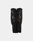 This dazzling mini-dress is entirely covered in black sequins, creating a shimmering effect. It features a deep V-neckline with a twisted knot detail at the waist that creates flattering ruching across the bodice and skirt. The dress has long sleeves and a fitted, short silhouette. The back of the dress has a simple, straight cut across the back.