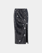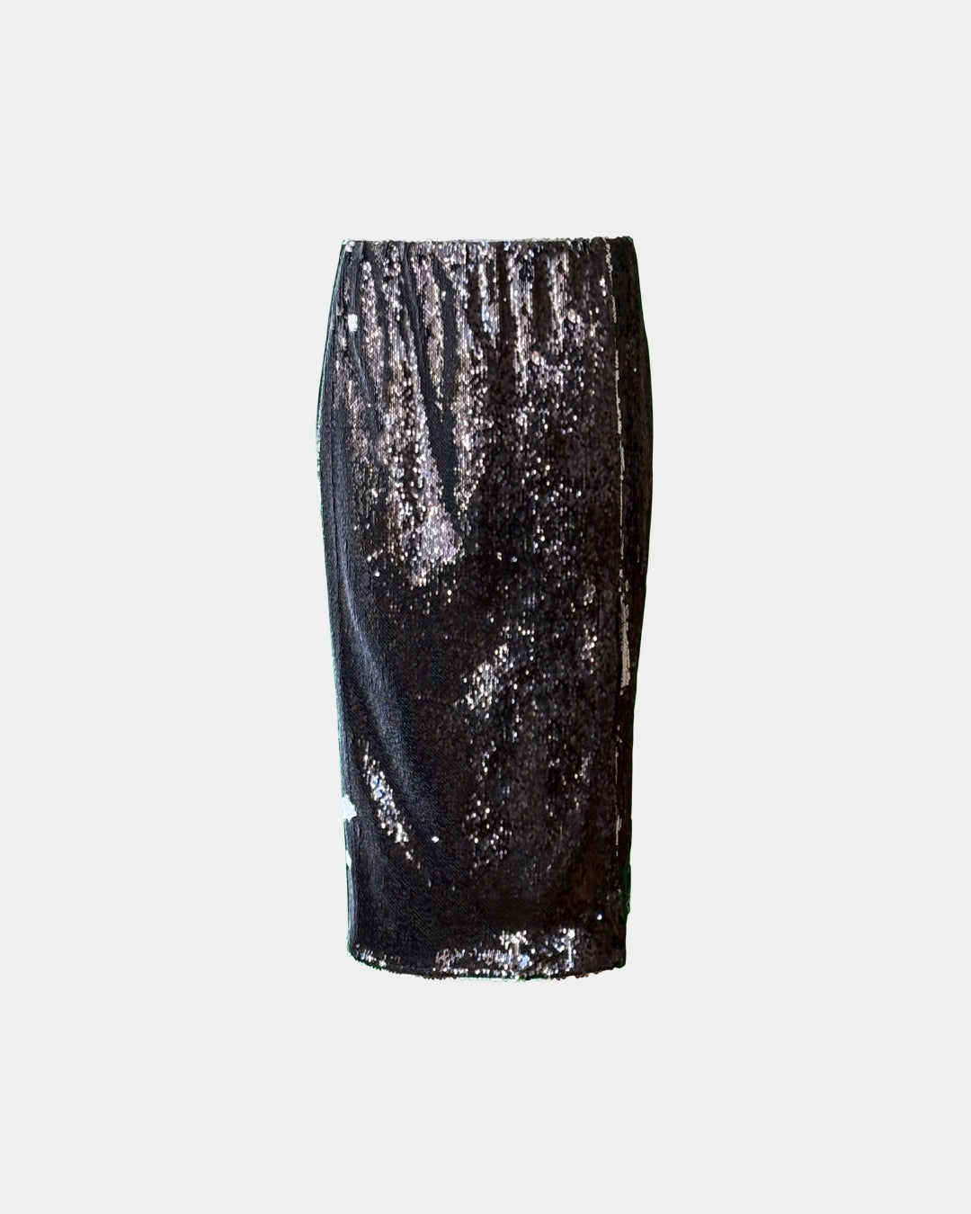 Der Paillettenstoff sorgt für ein edles, intensives Schimmern und reflektiert das Licht auf subtile Weise. Ein dezenter Schlitz bringt Bewegung und ausgewogene Sinnlichkeit in das Design und bleibt dabei der minimalistischen Handschrift der Marke treu.