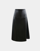 This midi skirt is crafted from innovative pineapple leather, giving it a smooth and supple texture. It features a high-waisted design with a wide, flat waistband, and a straight, pencil-style silhouette that falls below the knee. The back of the skirt features a visible vertical seam with a zipper closure, enhancing its tailored fit.