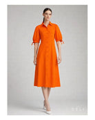 Das A-Line Leinenkleid in Orange vereint Leichtigkeit, klare Linien und die natürliche Struktur von reinem Leinen. Mit seiner Shirtdress-Silhouette, den verstellbaren Puffärmeln und der durchgehenden Knopfleiste entsteht ein eleganter Look, der zwischen Casual und Modern Chic perfekt balanciert. Der kräftige Orangeton bringt Energie und Persönlichkeit in jedes Outfit.