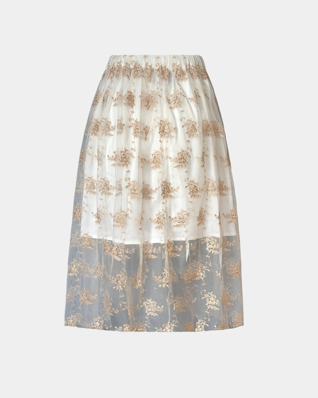 Das Design lebt vom mehrlagigen Aufbau: Eine transparente Tüllschicht mit zarter, floraler Stickerei überlagert ein dezentes Unterfutter und erzeugt Tiefe, Bewegung und visuelle Leichtigkeit. Die Länge endet im Midi-Bereich und macht den Rock vielseitig kombinierbar – sowohl für elegante Tageslooks als auch für besondere Anlässe.