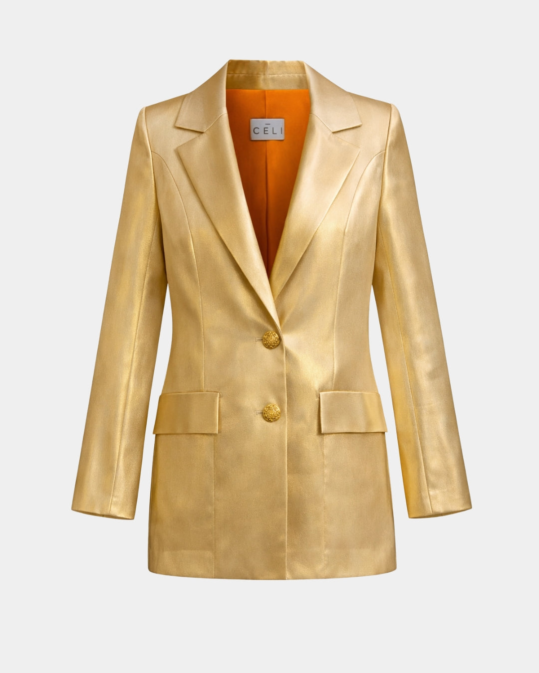 Sein mattes Metallic-Finish reflektiert das Licht mit warmer Zurückhaltung, während breite Revers und zwei goldene Knöpfe die Silhouette in perfekter Balance strukturieren.